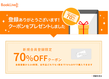 ブックライブに新規会員登録すると、全作品対象の「初回70%オフクーポン」をもらえます。利用は1冊・1回限りです。利用上限額はありません。有効期限は新規登録から24時間以内のため失効しないように注意しましょう。