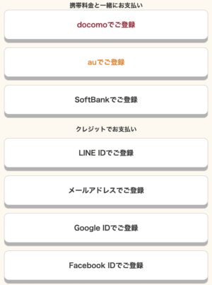 2.希望の支払い方法と、登録方法を選択します。支払い方法はキャリア決済かクレジットカードから選択できます。クレジットカード支払いの場合は、登録をLINEやメールアドレス、Google、Facebookから選択できます。