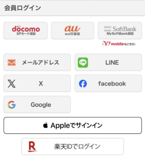 - 手順2会員登録の時に選択したアカウント(メールアドレスや楽天ID、LINEなど)を選択し、ログインします。